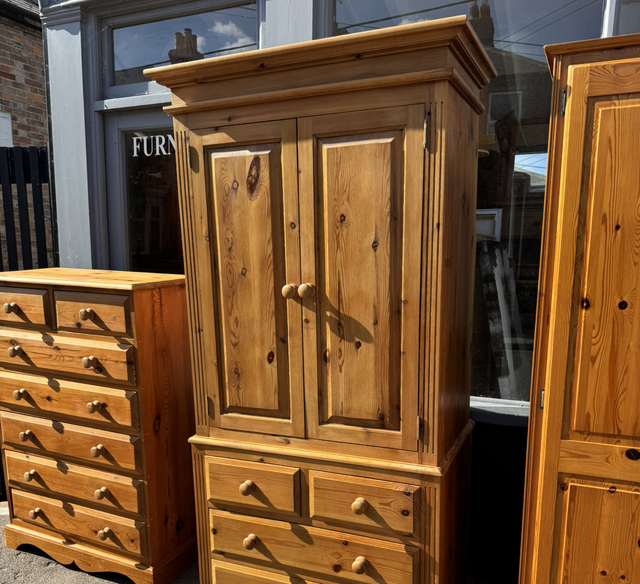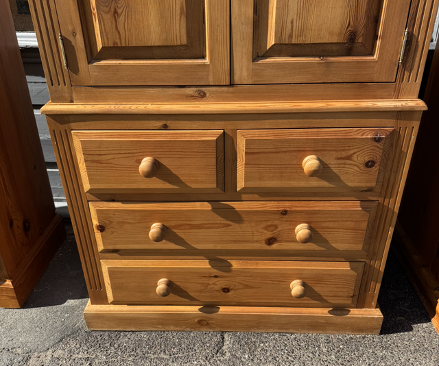 Large solid pine wardrobe with two large drawers and two smaller drawers in good condition.