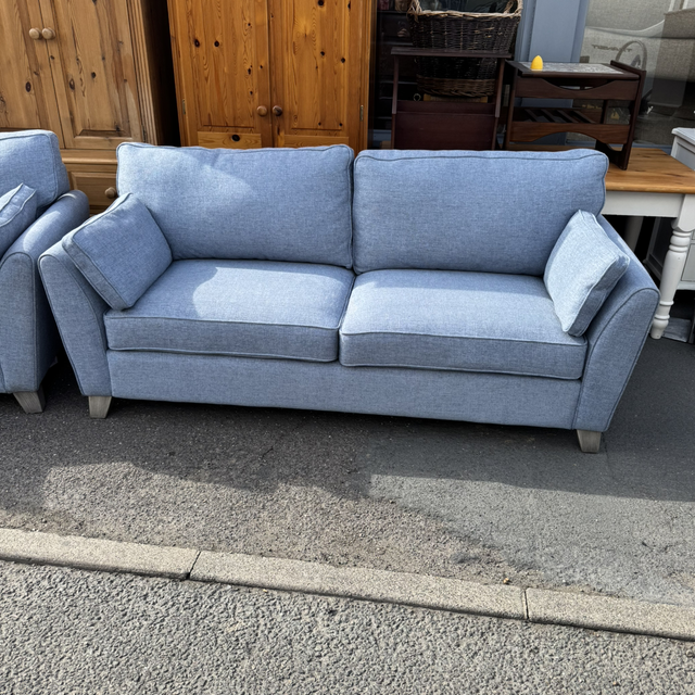 Modern blue fabric 3 seater sofa with matching armchair in fantastic condition like new.
