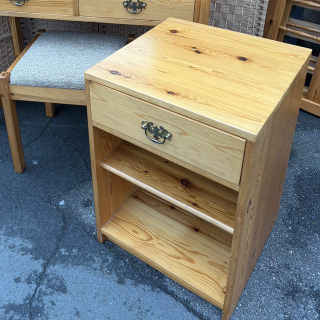 Solid pine dressing table with stool, mirror and matching bedside cabinet all in great condition.